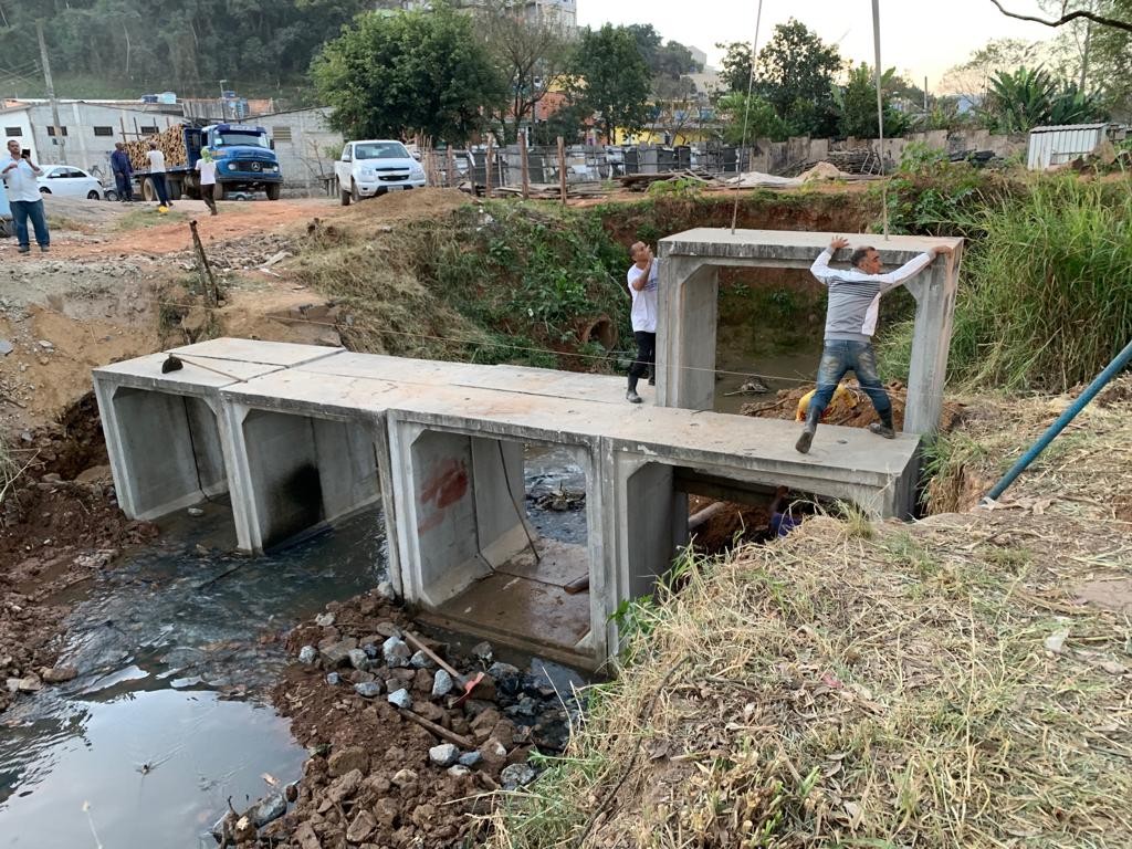 Além da implantação das aduelas, foram realizados serviços de limpeza e capinagem da margem do córrego e arredores.